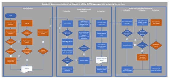 Building upon the theoretical foundations provided in Section 2, we now define a concrete process that converts the R4VR-framework into practical guidelines for adoption of ML in critical decision systems. Unlike the original R4VR-framework, we start even before modeling and take into consideration the process of data collection, which is a key requirement of the EU AI Act. Also, we provide differentiation options for adapting the workflow based on the risk level of the application. While the original R4VR-framework prescribes that the final decision for every instance is made by a human, which is unpractical in certain real-world use cases where thousands of images have to be examined every day, we take a more flexible approach and show how our guidelines can be implemented in different use cases. To outline how the approach can work in real-world scenarios, we also consider two particular use cases, namely, medical diagnosis from images and visual inspection tasks, and show how—based on our guidelines—ML-based systems in these use cases can be implemented in accordance with the EU AI Act.