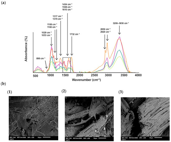 (a) ATR-FTIR spectra of PreH (orange line) *, PreH+DES 4 h (blue line), PreH+DES 8 h (purple line), and PreH+DES 16 h (light green line), and (b) SEM images of PreH DES 4 h (1), PreH+DES 8 h (2), and PreH+DES 16 h (3) *. * Results from part I [5].