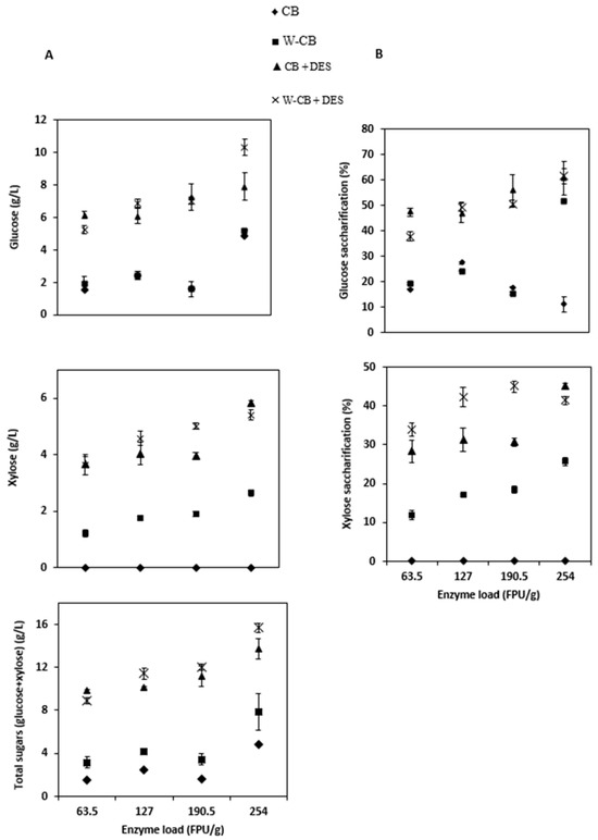Study of enzyme dosage in enzymatic hydrolysis of CB, W-CB, and all CRMs after DES pretreatment, (A) released glucose, xylose, and total sugars (g/L) and (B) glucose and xylose saccharification (%). Error bars correspond to n = 2.
