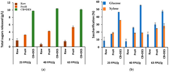 As other pretreatments were added to the process, lower amounts of enzyme (23, 40, and 63 FPU/g) were assayed in materials after sequential pretreatments (W-CB+DES, PreH+DES 4 h, PreH+DES 8 h, and PreH+DES 16 h) compared to prior enzymatic hydrolysis. In this sense, the initial three materials (CB, W-CB, and CB+DES) were also submitted to enzymatic hydrolysis under lower enzyme amounts to obtain comparative data (Figure 3 and Figure 4).