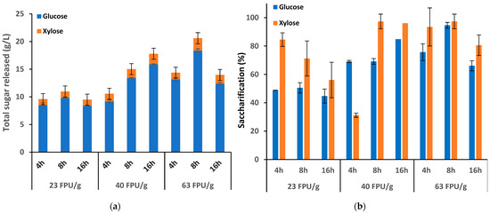 Sole DES pretreatment did not overstep 46% and 35% saccharification yields of glucose and xylose, respectively. However, sequential prehydrolysis and DES pretreatments showed the best saccharification yields at any time of DES pretreatment studied (Figure 4a). In this sense, PreH+DES 8 h achieved the best performance under any enzyme load studied. For instance, at intermediate enzyme load (40 FPU/g), release around 15 g/L of total sugars, corresponding with 70% of glucose and more than 95% of xylose saccharifications (Figure 4b). In this sense, Auxenfans et al. [48] also noted that sequential diluted acid and ionic liquid pretreatment improved saccharification yields compared to single pretreatments.