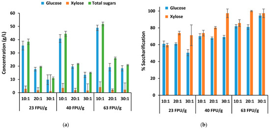 The results illustrated that when the enzyme load increases, maintaining the same LSR, the total sugars released also increase. This trend was observed for all LSRs assayed. For instance, at LSR 20:1, the total sugars increased from 19.55 g/L < 21.69 g/L < 26.01 g/L in ascending order of enzyme load (23 < 40 < 63 FPU/g). As expected, enzymatic saccharification also followed the same tendency previously mentioned; therefore, the best results were achieved at higher enzyme load using 63 FPU/g at LSR 30:1 (v/w) with 95% and 97% of glucose and xylose saccharifications, respectively. However, remarkable results were also attained at lower enzyme load (23 FPU/g) using LSR 20:1 (v/w) with 60.97% and 73.89% saccharification percentages of glucose and xylose.