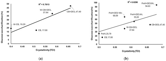 (a) Relationship between glucose saccharification of CB, W-CB, CB+DES, and W-CB+DES at 63.5 FPU/g and their TCI values, and (b) Fit between glucose saccharification of CB, CB+DES, PreH, PreH+DES 4 h, PreH+DES 8 h, and PreH+DES 16 h at 40 FPU/g.