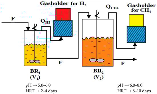 In the TSAD system (Figure 1), relatively fast growing acidogens and H2-producing microorganisms are grown in the first stage, the hydrogenic bioreactor (BR1 with working volume V1). They are involved in the production of VFAs and H2. On the other hand, the slow growing acetogens and methanogens are grown in the second stage, the methanogenic bioreactor (BR2 with working volume V2), in which the produced VFAs are further converted to CH4 and CO2. It is known that the overall energy recovery results are significantly higher for the two-stage H2 + CH4 system as compared to the traditional one-stage CH4 production process [9].