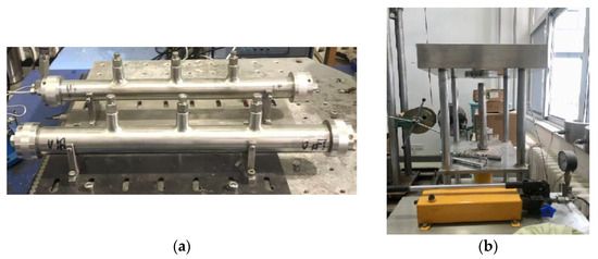 To produce artificial cores with varying permeability, cylinders with a φ 2.4 cm and varying lengths were used in conjunction with an artificial core production device made by Jiangsu Hongbo Machinery Manufacturing Co., Ltd, Jiangyin, China. The artificial cores were formed by repeatedly inserting the smaller diameter cylinders into the sand pack and compacting the sand until the core was fully formed. Figure 1a,b shows artificial core devices (sand packs) and core-making devices. A total of 24 artificial cores were created in six groups, with both high and low-permeability cores in each group to ensure consistency.