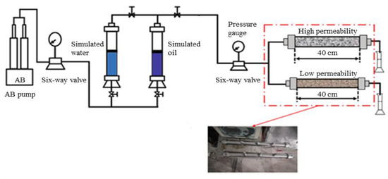 The experiments involved three main phases: core saturation with simulated water to establish connate water saturation, initial oil saturation, and water flooding. De-ionized water, simulated water, and simulated oil were separately placed into transfer cylinders. The dry weight of each core was measured before connecting it to displacement equipment. The core was then saturated with simulated formation water injected at a 1 mL/min flow rate for 8 h to mimic seepage flow conditions. After the core was saturated with simulated water, its wet weight was recorded, from which the pore volume and porosity were calculated. The permeability of each sand pack was then determined using Darcy’s law based on the flow data obtained during the experiment. Simulated oil was injected into each core until irreducible water saturation was reached, with more than 10 pore volumes (PVs) of oil injected into each model. Afterwards, the models were left idle for 8 h to stabilize pressure. Following this, steady-state and pulsating water flooding experiments were conducted. For steady-state water flooding, a solenoid valve was opened while, for pulsating water injection, the solenoid valve’s switching time was adjusted (frequency of 1 Hz, amplitude of 1 MPa) [31].