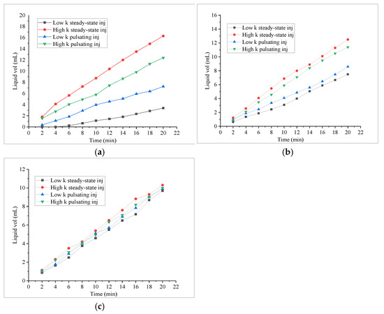 Figure 7b shows the behaviour of the 2-5 core group with the permeability contrast of 194.5 μm2 under different injection modes. In the same water injection mode, liquid production in high and low-permeability cores differed at any observed time. Under steady-state water flooding, fluid flow was observed from high and low permeability cores at the beginning of water injection. Liquid production increased over time, with the high-permeability core showing a more significant increase than the low-permeability core. The difference between the two curves indicates that the water injection flow into the high permeability core was consistently higher than that into the low permeability core at any observed moment. In the first 20 min, the average partial flows were 72.2% for the high-permeability core and 27.8% for the low-permeability core.