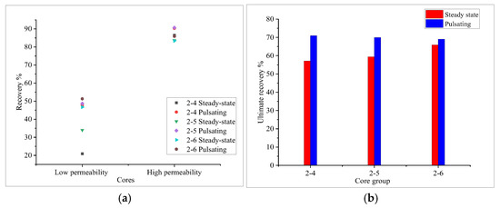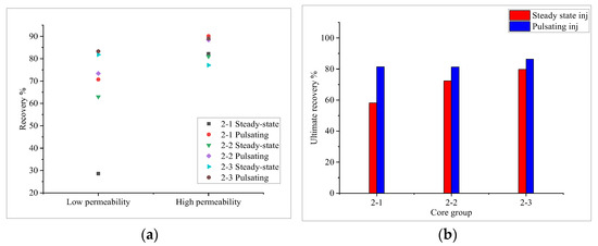 Figure 6a shows the recovery relationship of interlayer heterogeneities core groups with the injection modes. The experimental results demonstrated that pulsating water flooding improved recovery rates for both high and low-permeability cores compared to steady-state water flooding [12,14,24,45]. In core group 2-1 under steady-state, the ultimate recovery rates were 82.2% for high-permeability cores and 28.6% for low-permeability cores. However, under pulsating water flooding, these rates increased to 90.1% for high-permeability cores and 70.7% for low-permeability cores, showing an improvement of 7.9% and 42.1%, respectively. In core group 2-2, the recovery rates under pulsating flooding were also higher than for steady-state flooding. The recovery rate for high-permeability cores increased from 81.0% to 88.4%, and for low-permeability cores, rose from 63.0% to 73.4%. For core groups 2-3, pulsating water flooding also yielded higher recovery rates than those for steady-state flooding. High-permeability cores showed a recovery rate of 89.0%, while low-permeability cores showed 83.3% recovery under pulsating flooding. The recovery rates were 11.9% and 1.5% higher for high and low permeability cores under pulsating flooding than steady-state flooding.