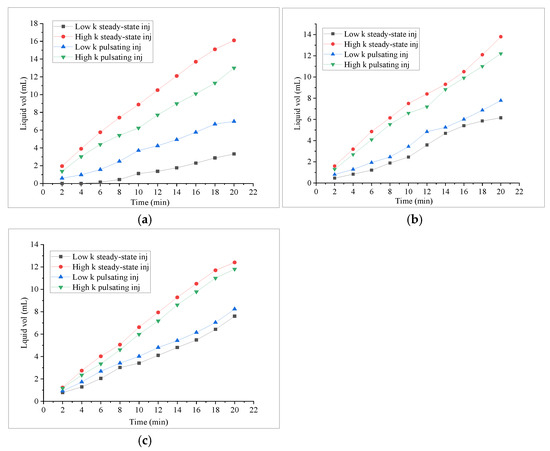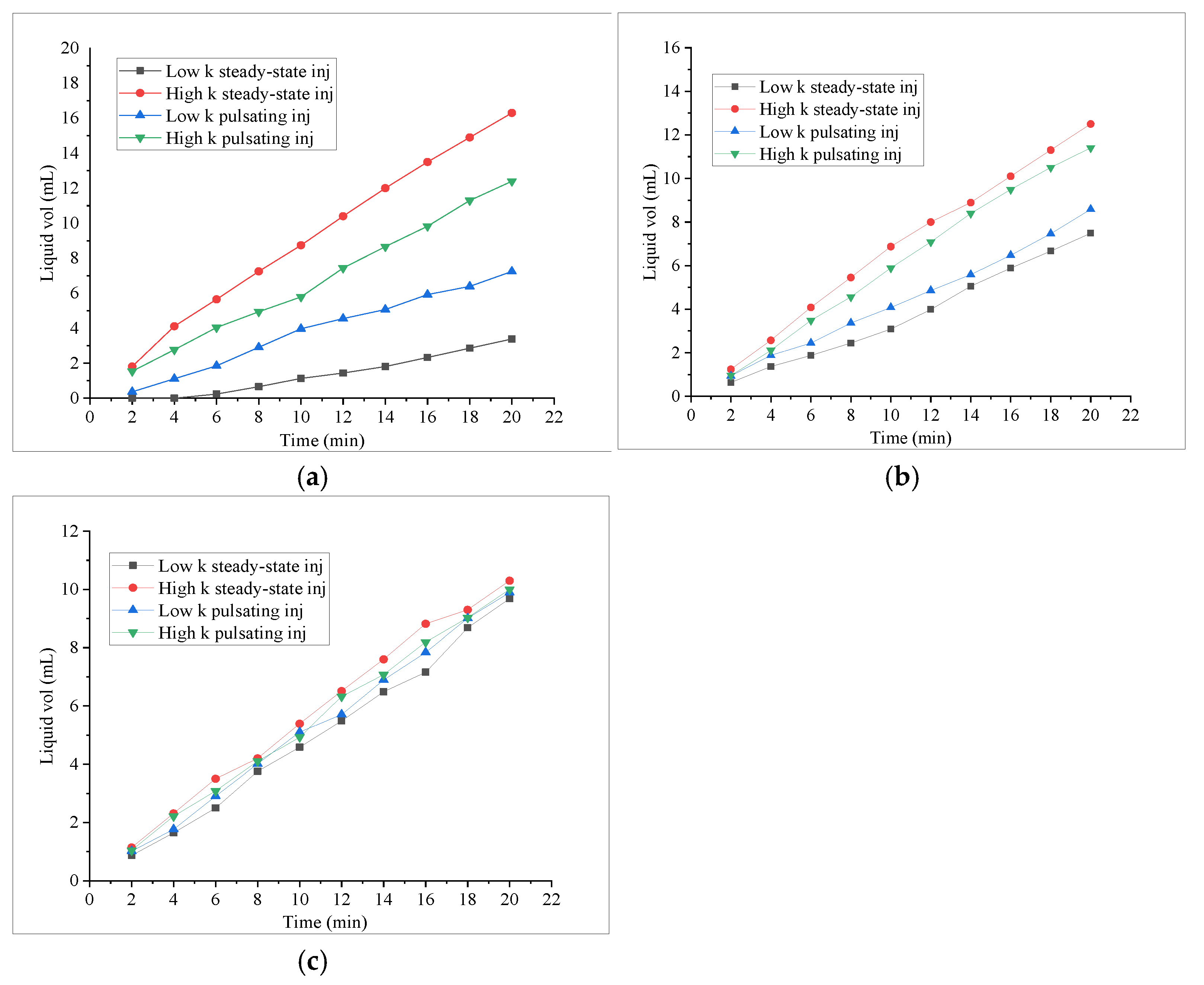 The experimental results and the analysis of interlayer heterogeneity during waterflooding are presented. The study includes three core groups, each representing different permeability and contrast levels between the layers. These groups were designed to simulate various interlayer heterogeneity scenarios, allowing for a comprehensive assessment of how vertical permeability variations influence injected water distribution and sweep efficiency [8,44]. Table 2 presents the laboratory experimental results involving water injection modes for core groups with interlayer heterogeneities. The relationships between the injection water flow rate and water injection mode under different permeability contrasts were plotted. Figure 5a–c shows the relationship between the liquid volume produced in the layers versus injection time for the first 20 min for each core group. By analyzing the data obtained from the sand pack models configured with interlayer heterogeneities, we can understand how these variations influence the behaviour of the flooding process. Permeability contrast is equal to (high–low) permeability.