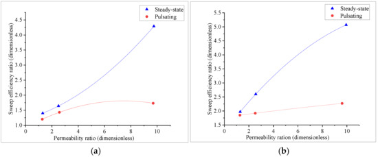 The curve between sweep efficiency recovery ratio and permeability ratio (a) interlayer heterogeneity (b) Inlayer heterogeneity.