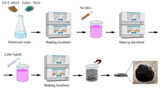 After one hour of stirring, a 25 mL solution of 10 mg/mL of diluted NCQDs was added to the flask, and the reaction continued for 30 min. Then, 20 mL of 2M NaOH was gradually added dropwise to the solution to enhance mixing, resulting in the formation of a black precipitate. The reaction was allowed to stir for an additional 2 h until the black precipitate was fully formed. External magnets (permanent magnets) were used to separate the black precipitate from the mixture through decantation. Finally, the black precipitates were washed with deionized water and dried at room temperature under vacuum conditions. The process flow to produce magnetite NCQDs in powder form is shown in Figure 2.