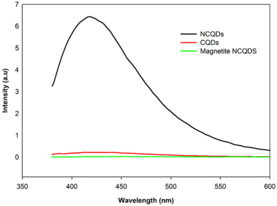 To analyze the movement and recombination process of electron–hole pairs, PL was used to assess the fluorescent properties of CQDs, NCQDs, and magnetite NCQDs. Based on Figure 4, the excitation wavelength for CQDs was found to be 435 nm, while that for NCQDs was 433 nm. These luminescent characteristics may be due to the presence of abundant trap states resulting from sp2 hybridization of carbon clusters and minor variations in the quantum dots’ size distribution.