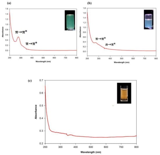 UV-Vis spectra of (a) CQDs (with the emission appearance shown in the inset on the right), (b) NCQDs (with the emission appearance shown in the inset on the right), and (c) magnetite NCQDs (with the emission appearance shown in the inset on the right).