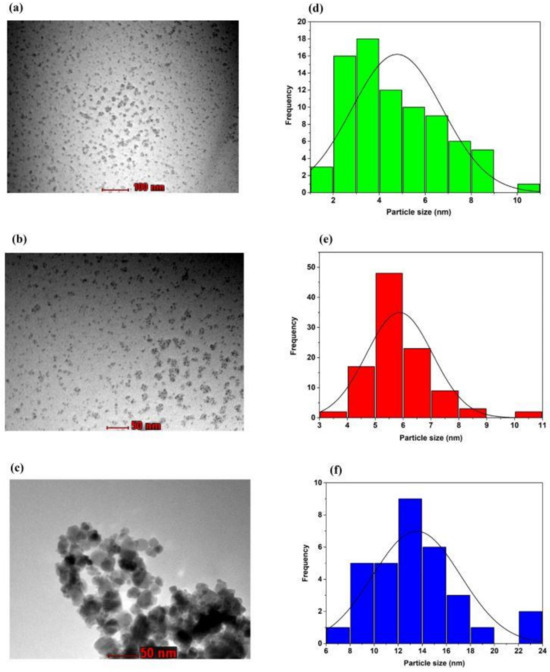 TEM images of (a) CQDs, (b) NCQDs, and (c) magnetite NCQDs in addition to the size distributions of (d) CQDs, (e) NCQDs, and (f) MNCQDs.