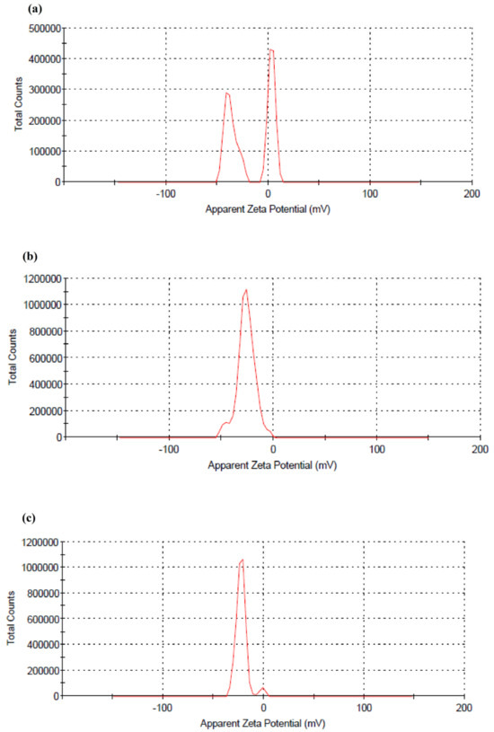 Zeta potential distribution of (a) CQDs, (b) NCQDs, and (c) magnetite NCQDs.