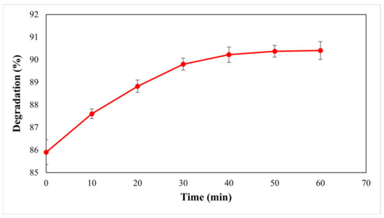 A tramadol solution of 10 mg/L was prepared, and 0.05 g of magnetite NCQDs was added. The process involved two stages, adsorption in the dark for 40 min and allowing tramadol to bind to the NCQDs, which achieved tramadol removal of about 85.9%. This was followed by photocatalysis under visible light. Samples were taken at intervals, and the degradation rate was calculated by comparing each sample’s concentration to the initial level. The optimal contact time was identified as 50 min, where degradation stabilized, as shown in Figure 13.