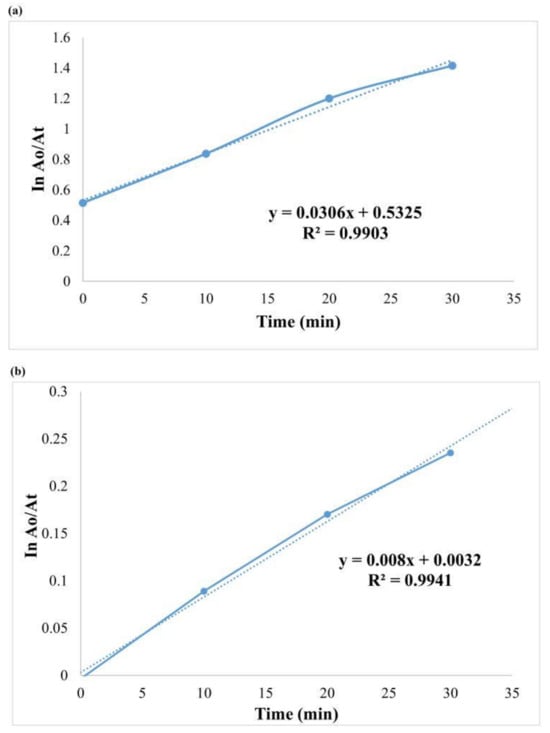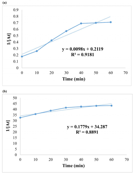 where k is the first-order rate constant, calculated as the slope of the linear plot of ln (A0/At) versus time t. The data were also analyzed with a second-order kinetic model displayed by Equation (7) [15], which assumes a reaction rate proportional to the square of the reactant concentration. For this model, the rate constant k was determined from the slope of the linear plot of 1/At against time t.