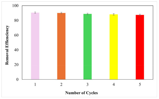 Magnetite NCQDs act as the adsorbent and the photocatalyst in removing tramadol in wastewater treatment plants through adsorption and photocatalysis. After the adsorption and photocatalysis, the magnetite NCQDs are easily separated from the aqueous solution using the external magnet. In order to be considered eco-friendly, the magnetite NCQDs were evaluated for their recyclability [31]. The removal efficiency slightly dropped from 86% to 80.8% after five successive cycles, as shown in Figure 18. The desorption of tramadol was conducted at pH 1 by using 0.1M of HCI in continuous shaking mode in order to remove the tramadol from the surface of magnetite NCQDs. During the fifth cycle, the tramadol removal efficiency from the spent adsorbent dropped to approximately 80%. Above five cycles of usage, the magnetite NCQDs led to tramadol removal below 80%. Thus, the current study limited the recyclability of the magnetite NCQDs to only five to ensure effective removal efficiency.