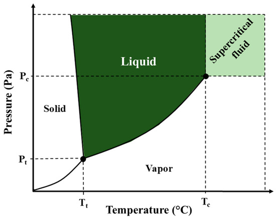 Supercritical fluid extraction is a widely used technique for extracting compounds of interest from a solid matrix. In the process, the fluid used is submitted to conditions above its critical point of pressure and temperature in order to improve its physical–chemical properties and enhance the solubilization of predominantly hydrophobic and slightly polar compounds [35]. Figure 1 presents a pressure–temperature diagram of an arbitrary pure substance, showing the critical point (Pc—critical pressure; and Tc—critical temperature) of the distinction between the liquid and gaseous phases of the compound. Above this point, the fluid assumes so-called “supercritical” conditions, combining desirable properties of both phases, making it a “solvent with adjustable properties” to selectively extract different compounds according to variations in pressure and temperature imposed on the system [30].