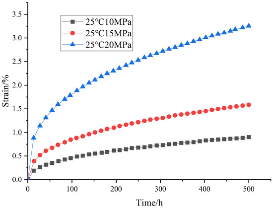 According to Gunther R. M. et al. [34], salt rock cores collected from Brazilian Santos Basin at a depth of 4102.99 m were used to conduct creep tests at 25 °C, 50 °C, and 75 °C for 21 d. Based on the obtained test curves in Figure 2, Figure 3 and Figure 4, the creep constitutive equation of salt rocks is [15]: