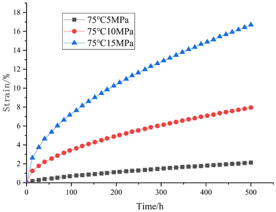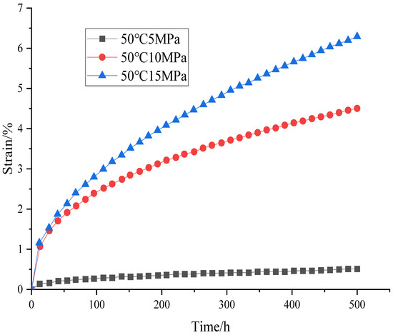 Test data of Gunther R. M. et al. [34] were all obtained from rock cores taken from the extremely thick strata in Brazilian Santos Basin and, therefore, are accurate and reliable. The strain at the boundary between the decelerated and steady-state creep stages also decreases. Fortran language is used to compile the UMAT subprogram to embed the above creep constitutive model of salt rocks into the finite element analysis tool ABAQUS 2022. Figure 2 shows a triaxial testing machine on which we can carry out long-term creep experiments. As shown in Figure 3, with the increase in applied load, the creep rate of salt rock decreases in the deceleration creep stage but increases in the steady creep stage. The creep rate of salt rock also increases with the increase in temperature. We fit the curves in Figure 3, Figure 4 and Figure 5 to obtain the parameters in the creep criteria.