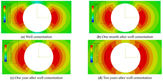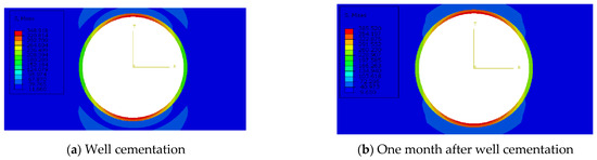 In Equation (7), a is the inner diameter of wellbores; b is the inner diameter of casings; and r is the distance from the research point to the wellbore axis [35]. Under the action of liquid-column pressure in casings Pi and collapse pressure Pa(t), the radial displacement of the outer wall of casings in the combination is:
