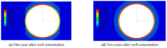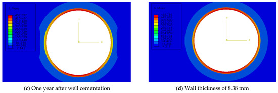 When applying collapse pressure onto the casing wall to reach the yield strength of the casing, the casing body undergoes plastic deformation. Under the condition, it is regarded unsafe. In accordance with the API standard, four wall thickness standards are available for the corresponding casing of wellbores, namely, 8.38, 9.65, 10.92, and 12.19 mm. Figure 16 displays the Mises stress on the inner wall of casings with different wall thicknesses 10 years after well cementation, which shows that the Mises stress on the inner wall decreases with the increasing thickness of the casing selected. Therefore, it is concluded that increasing the wall thickness of casings is an effective approach to improve the collapse resistance. The Mises stress nephograms of casings with different wall thicknesses is shown in Figure 18. The Figure 19 shows the wall thickness–stress curves in different directions.