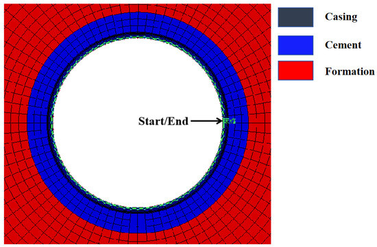 The above calculation of casing stress is only applicable to non-ruptured rheological formations with a small dip angle. Structured grids are both used for the cement sheath and salt formation, which are refined in the vicinity of the wellbore. The grid size of elements of salt rocks near the wellbore is set to be 0.01 m. Based on the commercial finite element software ABAQUS 2022, the constitutive models, boundary conditions, and edge loads are embedded in ABAQUS using the secondary development function DLOAD and DISP subprogram. Then, the change process of displacement in the creep process of underground salt rocks and its influence on wellbore deformation are computed.