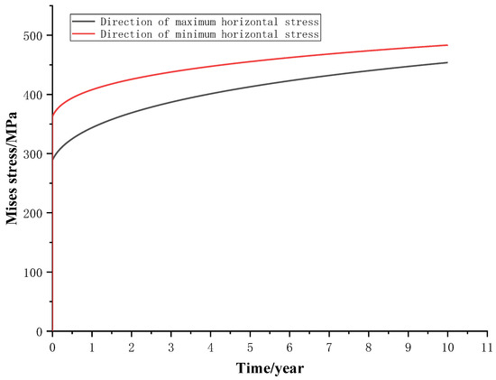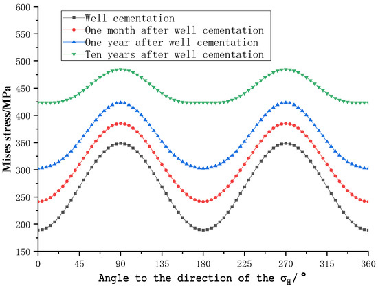 The displacement constraint on the wellbore needs to be relieved in the second step, namely, VSICO analysis. Under nonuniform geostress, the formation, casing, and cement sheath come into close contact, the casing and cement sheath are well cemented, and the external load on the casing is mainly caused by creep of the salt formation under geostress. The external load generated by creep of the formation is transferred from the salt formation to the cement sheath, from which it is then applied to the outer wall of the casing. As a result, a contact pressure is generated on the outer wall of the casing and the inner wall of the cement sheath, and the maximum stress on the casing is found on the inner wall. X and Y are set as the directions of the maximum and minimum horizontal principal stresses, respectively. To further show changes in the radial displacement during creep of salt rocks, the Mises stress nephograms, radial stress nephograms, and deformation nephograms of the casing in the salt formation at different moments were drawn. Figure 9 shows the Mises stress nephograms, Figure 10 shows the circumferential path on the casing wall, and Figure 11 shows the Mises stress distribution on the inner wall of casings.