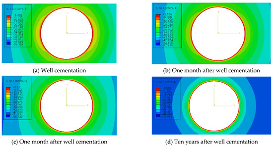 Casing deformation is a progressive process. To quantitatively study the stress and deformation characteristics of the casing under nonuniform geostress, nodes on a circumferential path of the casing are selected to extract and analyze physical quantities at these nodes. The starting point of the path corresponds to the direction of the maximum horizontal principal stress and the end of the path coincides with the starting point. The circumferential path separately experiences the maximum and minimum horizontal principal stresses. Figure 12 shows the radial stress nephograms.