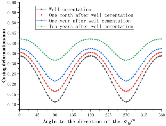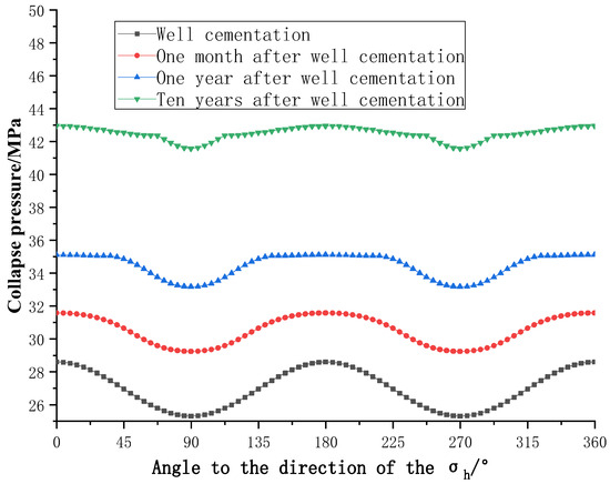 Change curves of Mises stress on the outer wall of casings with time are illustrated in Figure 13. When well cementation is completed, the nonuniform geostress is instantaneously applied to the cement sheath and then transferred to the casing. The Mises stress on the inner wall grows with an increase in the angle with the direction of the maximum horizontal principal stress. When the angle is 0°, the Mises stress on the inner wall of casings is 349 MPa; when the angle is 90°, the Mises stress on the inner wall is 486 MPa. Obviously, the casing is most likely to be damaged along the direction of the minimum principal stress in the elastic deformation stage. As the creep continues, the Mises stress on the inner wall of casings gradually ramps up, while its value tends to be uniform. When the stress is relatively uniformly distributed on casings, it needs to check the collapsing strength of the casing. Figure 14 shows the collapse pressure on the outer wall of casings 30 days after well cementation. It can be seen from Figure 14 and Figure 15 that, in the elastic deformation stage of the formation, the collapse pressure on the casing reaches the maximum in the direction of the minimum horizontal principal stress and the minimum in the direction of the maximum horizontal principal stress. As the creep further proceeds, the distribution of collapse pressure on the outer wall of casings changes, and its value tends to increase at first and then decrease with the enlargement in the angle with the direction of the maximum horizontal principal stress.