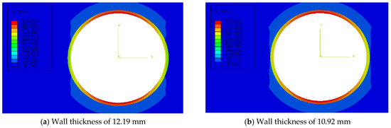 Mises stress nephograms of casings with different wall thicknesses.