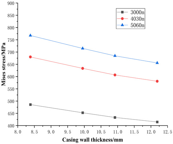 Change curves of casing stress with wall thickness at different burial depths of salt formations.