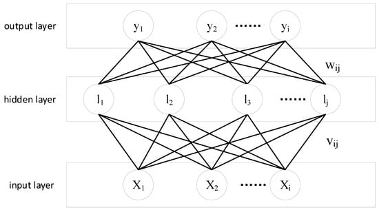 Because of the nonlinear modelling ability and data-driven characteristics of multilayer neural networks, they have good characteristics in solving regression-type problems. The BP neural network is a multilayer feed-forward neural network, which adjusts the weights and biases in the network through the characteristics of signal forward propagation and error backpropagation []. The structure of the BP neural network is divided into an input layer, a hidden layer, and an output layer, and the number of neurons in the input layer is determined by the input features of the model; the number of neurons in the output layer is determined by the number of outputs of the model, and the number of neurons in the hidden layer is derived through empirical formulas or model tuning. The network structure is shown in Figure 4.