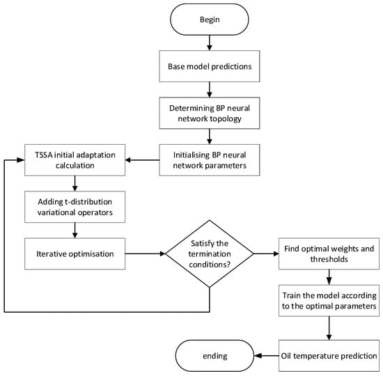 The process first takes the base model prediction results as input to the BP neural network and initialises the parameters of the BP neural network. After that, the weights and bias of the BP neural network are optimised using the TSSA optimisation algorithm, and the process starts with initialising the sparrow population position, after which the t-distribution variance operator is added to the position updating process, with the discoverer updating the position to simulate the global search and the follower updating the position to simulate the local search, and the optimal individual of the population position is finally determined. After judging that the termination conditions are satisfied, the optimal weights and thresholds are output, and the model is trained according to the optimal parameters, and then the final prediction of transformer oil temperature is completed.