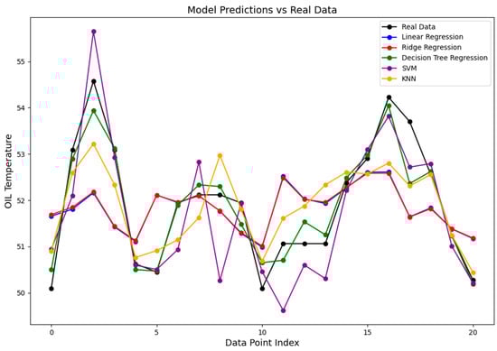 The multi-model fusion approach first requires the use of a base model for prediction, which provides an initial prediction of the transformer oil temperature through five machine learning methods. Based on the grey correlation calculation, it is determined that the inputs to the model consist of load current, ambient temperature, load factor, and active power, and the output of the model is oil temperature. The small-scale dataset and larger-scale dataset of summer high load are selected for the presentation of the base model’s prediction results; a total of 180 sets of data from the summer high load small-scale dataset are used for training, and 20 sets of data are used for testing. The summer high load larger-scale dataset used 1800 sets for training and 200 sets for testing.