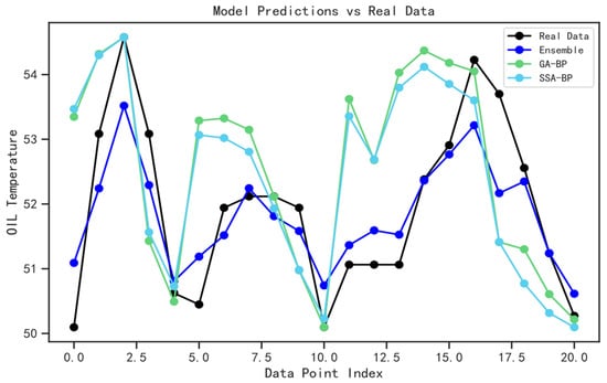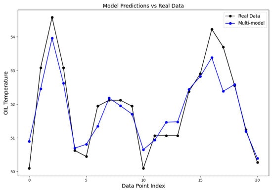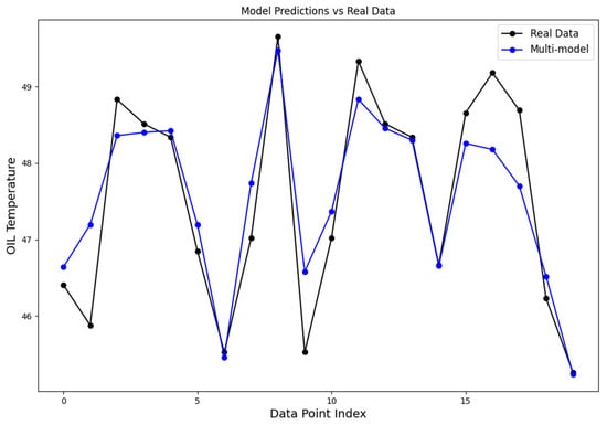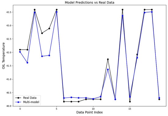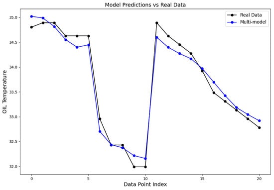 As can be seen from Table 8, the multi-model fusion method also has good results in the 2000-group data size case, which proves the feasibility of the method for larger datasets as well. The prediction error is minimised in the case of high load in winter, with an RMSE of 0.3694 and an MAPE of 0.71%. The prediction error is highest in the case of low load in winter, with an RMSE of 1.0877 and an MAPE of 1.58%. From the experimental results, it can be obtained that the error between the predicted value and the actual value of the multi-model fusion prediction method is about one degree, and the purpose of the transformer oil temperature prediction is to evaluate the transformer operation status or obtain early warning of abnormal data according to the predicted value, and the error of one degree or less is basically in line with the actual requirements of the project.