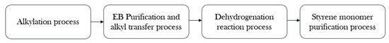 In the alkylation process that produces ethylbenzene (EB), ethylene reacts with benzene. EB purification and trans-alkylation processes then refine the produced ethylbenzene and recover the byproducts. Subsequently, the process advances to the dehydrogenation reaction stage, in which ethylbenzene is converted into a styrene monomer. Finally, in the SM purification process, unreacted materials, impurities, and byproducts are removed from the styrene monomer.