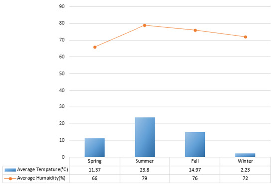As shown in Table 3, the seasonal weather conditions for 10 years in the area where the target facility is located were analyzed and shown in Figure 4. The average temperature in spring (March to May) was 12.68 °C and the average humidity was 12.68 °C. 77.57%, the average southeasterly wind speed is 2.13 m/s. During summer (June to August), the average temperature is 26.66 °C, with an average humidity of 91.43% and an average wind speed of 2.17 m/s with southwesterly winds. During fall (September to November), the average temperature is 15.92 °C, with an average humidity of 85.43% and an average wind speed of 1.86 m/s with northeasterly winds. During winter (December to February), the average temperature is 0.2 °C, with an average humidity of 79.67% and an average wind speed of 2.15 m/s with westerly winds [46].
