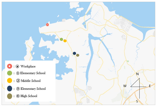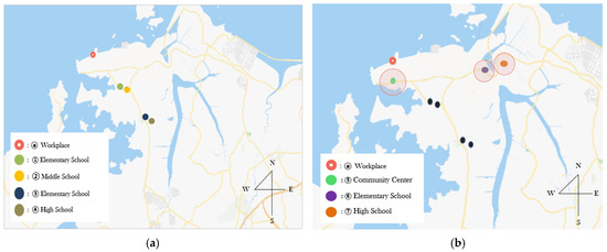 In this study, the correlation between meteorological conditions and chemical accidents was analyzed using the ALOHA software (version 5.4.7), confirming that affected areas vary by season. Based on these results, seasonal evacuation sites were proposed, taking into account meteorological factors such as wind direction and speed, as well as the number of evacuees traveling on foot. The comparison of current evacuation sites with additional proposed sites is summarized in Table 6, and their locations are shown in Figure 8.