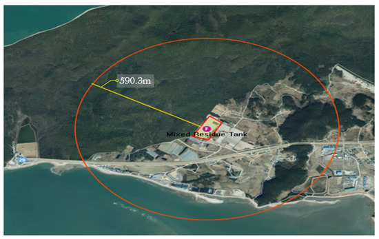 The analysis of the impact range of chemical accidents using KORA revealed an impact radius of 642.7 m and an off-site distance of 590.3 m. However, as shown in Figure 6, KORA only provides uniform ranges without considering wind direction.