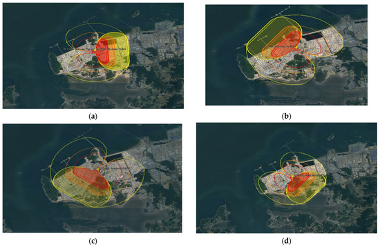 ALOHA was used to overcome these limitations. The analysis results, as shown in Figure 7, indicated that during spring, chemical substances spread westward and northwestward under the influence of southeasterly winds. During summer, they spread northward and northwestward due to southwesterly winds. In autumn, they dispersed southward under the influence of northeasterly winds, and in winter, they spread eastward owing to westerly winds.