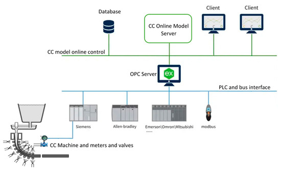 To create an online control system, the model was connected to a Level 1 automation control system [28] which was mainly composed of programmable controllers (PLCs) and several kinds of sensors. The model mainly needed pipeline electromagnetic flowmeters to measure the flow of mold cooling water and each secondary cooling water circuit, a continuous temperature measurement device for molten steel in tundish to observe the change in the temperature during the casting process as the initial condition for the model calculation, position coders to track the casting length and casting speed, and water flow regulating valves to control the cooling water flow of each circuit according to the model optimization. Then, these parameters’ sensors, position encoders, and temperature sensors were connected to PLCs with IO modules, and the PLC was connected to the model system through an OPC server. Therefore, the model could obtain on-site data, which mainly included casting speed, cast length, liquid steel temperature, and cooling water volume for each circuit, making online calculation of the process possible, and could also send an optimized data set to the PLCs. The architecture of the online control model system is shown in Figure 2 and the main parameters of the sensors are listed in Table 1.