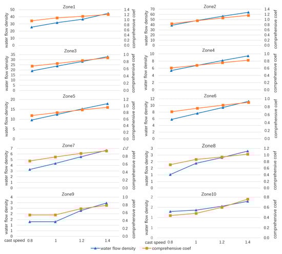 The model is applied to a CC production line of a steel manufacturing company. The CC machine has 10 secondary cooling zones; its main parameters are shown in Table 3. We tested the model when producing Q345B steel; the composition data are shown in Table 4. The real-time data of molten steel temperature, casting speed, cooling water of the mold, and cooling water volume of each cooling zone were connected from the site. We first used four boundary heat transfer methods in the offline simulation program to calculate the water flow density and total heat flux of each zone (zone1–zone10) at different casting speeds (0.8 m/min, 1.0 m/min, 1.2 m/min, 1.4 m/min). Then, according to Formula (6), the comprehensive heat transfer coefficient of each secondary cooling zone at four casting speeds was calculated. The water flow density and comprehensive cooling parameters of zones 1–10 under different cast speeds are shown in Figure 6. Then, according to the objective function of Formula (6), the GRG algorithm in Excel was used to calculate the , , and , so that the comprehensive heat transfer coefficient calculated by these parameters at various casting speeds in secondary cooling zone can be very close to the offline simulated . The , , and parameters of the comprehensive thermal heat transfer coefficient, as well as the error between the comprehensive heat transfer coefficient calculated by the offline simulation and calculated online in each cooling zone (-), are listed in Table 5.
