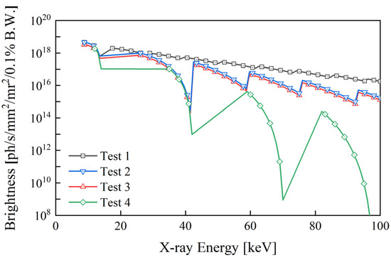 Using the simulation software Spectra [26], the energy and brightness distribution spectra of the X-rays under the four parameter conditions in Table 3 were calculated, as shown in Figure 3. The exposure time and frequency rate were kept the same across all conditions. The X-ray pulse duration is shorter than the exposure time, ensuring that the photons entering the camera vary based on the X-ray pulses rather than the exposure time. The calculation results indicate that, at the same energy, the brightness of the X-rays decreases progressively from Test 1 to Test 4, meaning that the number of photons decreases. The X-ray brightness is slightly higher under the dual-bunch condition compared to the single-bunch condition. When the insertion gap is set to 25 mm, the brightness of the high-energy portion of the X-rays (greater than 40 keV) decays rapidly.