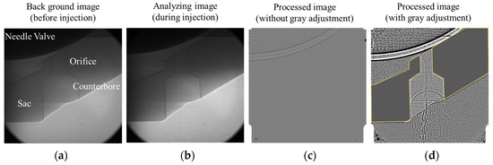 To enhance the clarity of the X-ray images, a multi-step preprocessing procedure was applied to all analyzed images. Taking the results of Test 1 as an example (Figure 4), the image undergoing analysis (Figure 4b) was first divided by the corresponding background image (Figure 4a) to remove background noise, producing a processed image without gray-level adjustment (Figure 4c). However, the internal flow features were still difficult to distinguish. To further enhance visibility, gray-level adjustment was performed using histogram equalization [27], resulting in the final processed image with improved contrast and clarity, which was used for analysis. These preprocessing steps were consistently applied across all images to ensure robustness and reliability, as illustrated in Figure 4.