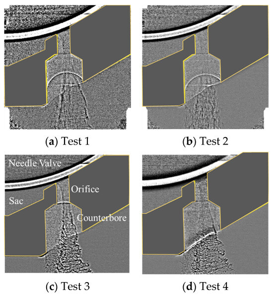 Test 3 was determined to provide the best image quality regarding the inner-nozzle flow imaging for the following reasons: the X-ray brightness was higher in Test 3 than in Test 4, allowing for better penetration of the injector nozzle’s metal casing. Compared to Test 1, Test 3 had a lower proportion of high-energy X-rays, improving phase contrast and enhancing the visibility of internal flow. Test 3 also used a single-pulse exposure with a 0.15 ns pulse width. With a jet speed of 200 m/s, the displacement during exposure was only 0.03 ms, which was smaller than the pixel size (2.54 ms), eliminating dynamic blur and ensuring a quasi-static flow representation. These factors make Test 3’s images the clearest and most accurate, as discussed in Section 3.2.2.