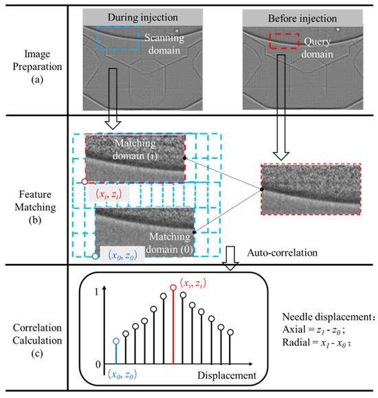 By combining synchrotron X-rays with high-speed imaging, continuous images of the injector nozzle interior can be captured, allowing for calculation of the needle valve’s motion. The Test 3 conditions were used for simultaneous in situ measurement of needle valve motion and internal flow. Figure 6 shows the calculation method: First, a query domain is defined on an image before injection, including part of the needle valve at rest (Figure 6a). In the moved image, a larger scanning domain is defined, covering the range of needle valve displacement. A matching domain, equal in size to the query domain, is extracted from the scanning domain (Figure 6b). The covariance of the grayscale matrices of the matching and query domains is calculated to obtain the correlation coefficient. This process is repeated step by step, and the maximum correlation coefficient indicates the needle valve’s position (Figure 6c). Based on the matching domain coordinates, axial displacement and radial offset can be calculated. For a detailed explanation of the method, please refer to the relevant references [28,29].
