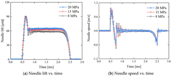 Figure 7a,b show the variation in the needle valve lift and its lift speed over time under different injection pressures. Figure 7a reveals a noticeable overshoot during the needle valve lift, likely due to the deformation of the needle valve rod. When the solenoid valve is energized, the armature drives the needle valve upward until it contacts the armature stopper. At this point, inertia causes the needle valve rod to bend, resulting in overshoot. Subsequently, the needle valve gradually recovers its shape, ultimately settling at its set position. Under different injection pressures, the lift curves during the lifting and closing stages of the needle valve remain consistent, as shown in Figure 7a. The needle valve’s motion is primarily influenced by the force from the solenoid valve and is independent of the fuel pressure in the injector. Once the needle valve is fully opened, fuel injection enters a steady state. At this point, as the injection pressure increases, the needle valve’s lift slightly increases. This phenomenon may be related to changes in the contact between the armature and the armature stopper. Experiments from our other investigations have shown that the contact between the armature and the stopper is not completely sufficient. The increase in fuel pressure improves this contact, making it tighter, which slightly raises the armature’s opening height and consequently increases the needle valve’s opening. These observations were obtained from commercial experimental investigations conducted as part of this study; however, due to proprietary constraints, specific details of these experiments are not publicly available. The results in Figure 6b show that the needle speed remains nearly unchanged under different injection pressures.