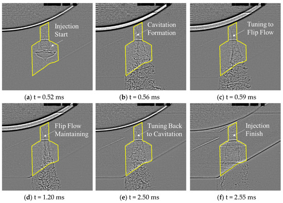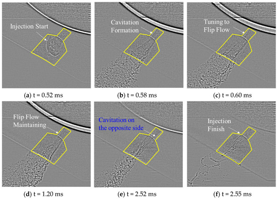 Figure 8a–f illustrates the variation in the fuel flow state within hole #2 at a fuel injection pressure of 15 MPa over time. As shown in Figure 8a, with the needle valve opening, a gas–liquid phase separation interface is observed on the left side of the nozzle hole, indicating cavitation formation inside the nozzle hole. At this stage, the tail of the cavitation is not clearly defined. The cavitation will reattach near the nozzle outlet. Once the fuel exits the nozzle and enters the counterbore, it expands rapidly and almost covers the entire counterbore exit, as shown in Figure 8b. A fuel wall impact phenomenon is observed near the left-side exit of the counterbore. It should be noted that the unclear gas–liquid phase separation interface in Figure 8a,b may be due to high turbulence intensity in the nozzle flow at low needle valve openings, which causes unstable cavitation and complex deformations in the nozzle. In the current imaging setup using the line-of-sight method, when cavitation is unstable and the nozzle flow has a complex twisted structure, part of the emitted light overlaps, affecting the resolution of the cavitation gas–liquid interface.